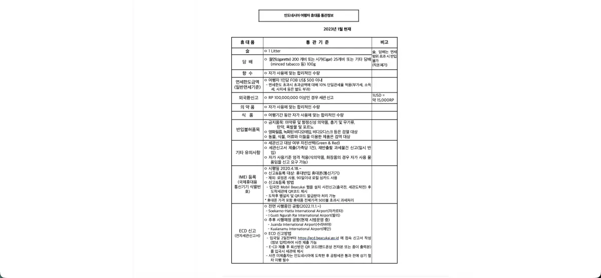 인도네시아 발리 여행자 휴대품 통관정보 공지사항
